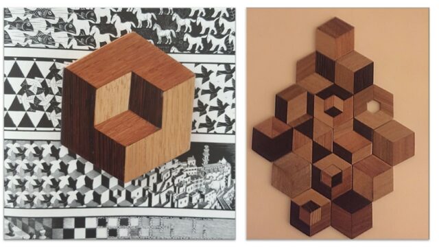 Waarom laag bij de vloer? Ruud legt uit: “Het materiaal van de onderzetters die ik zelf ontwerp en maak is restafval van parket. Dit wordt anders weggegooid. Nu krijgt het een tweede leven. Ik ben groot liefhebber van M.C. Escher: hoe hij speelt met verhoudingen, diepte, licht en donker. Je kunt er op verschillende manieren naar blijven kijken je afvragen ‘klopt dit wel?’.”