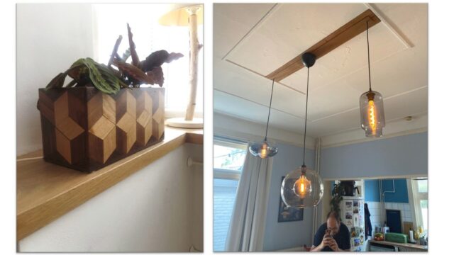 Ruud kan eindeloos variëren met het ontwerp en zo verschillende dimensies aan diepte creëren. Hij raadt wel aan om met meerdere houtsoorten te werken, of hetzelfde houtsoort te gebruiken maar dan af te wisselen in stukken met een andere houtnerf. “Het topstuk van al mijn creaties is een plantenbak, waarbij ik ook weer de vorm van de onderzetters heb gebruikt. Als je vanuit een bepaalde hoek ernaar kijkt lijkt het alsof je een dimensie mist en je voor de gek wordt gehouden, maar wissel je van perspectief lijkt het allemaal weer anders. Kun je uren naar kijken.”