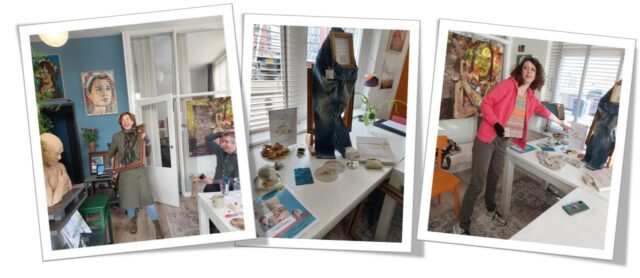 Jeanne had haar spijkerbroek met gouddraad voor de Golden Joinery Workshop gepronkt. Lachend kwam ze binnen als een ingelijst kunstwerk. Celine wijst nog even naar het logo dat ze voor Mooi Aandenken maakte.